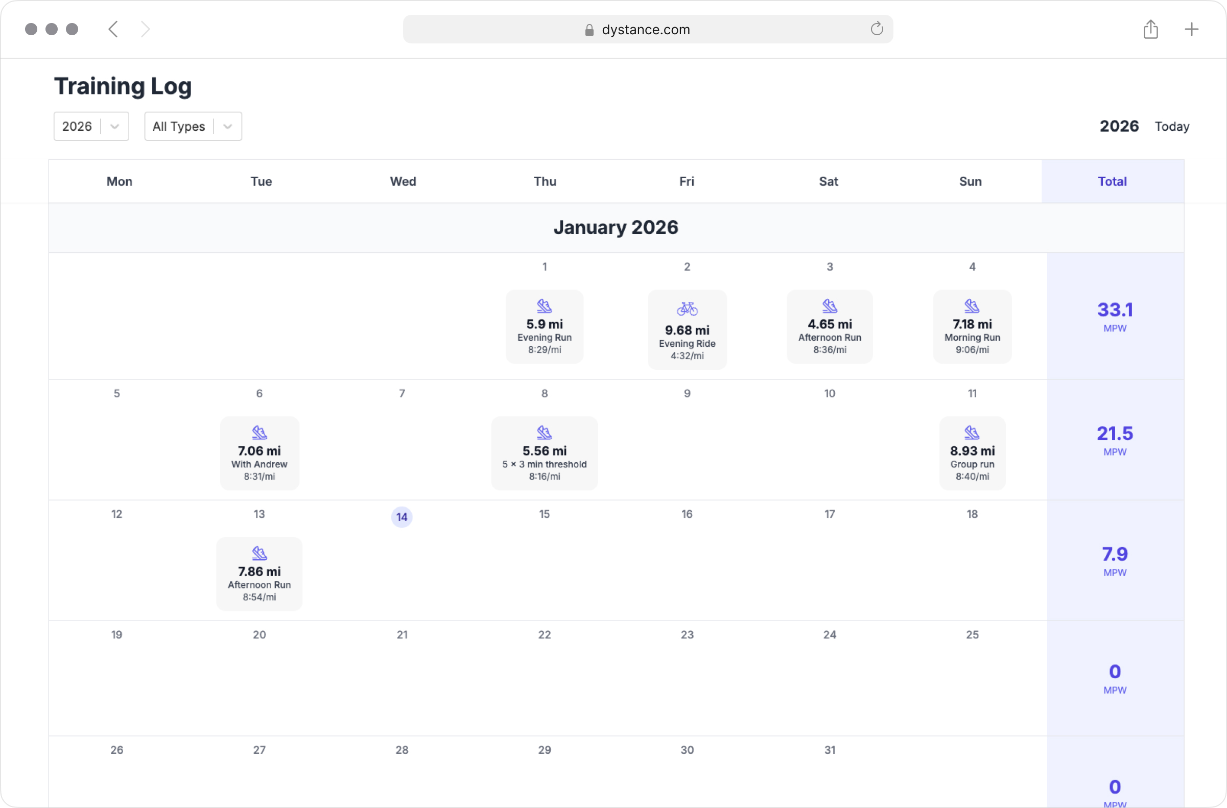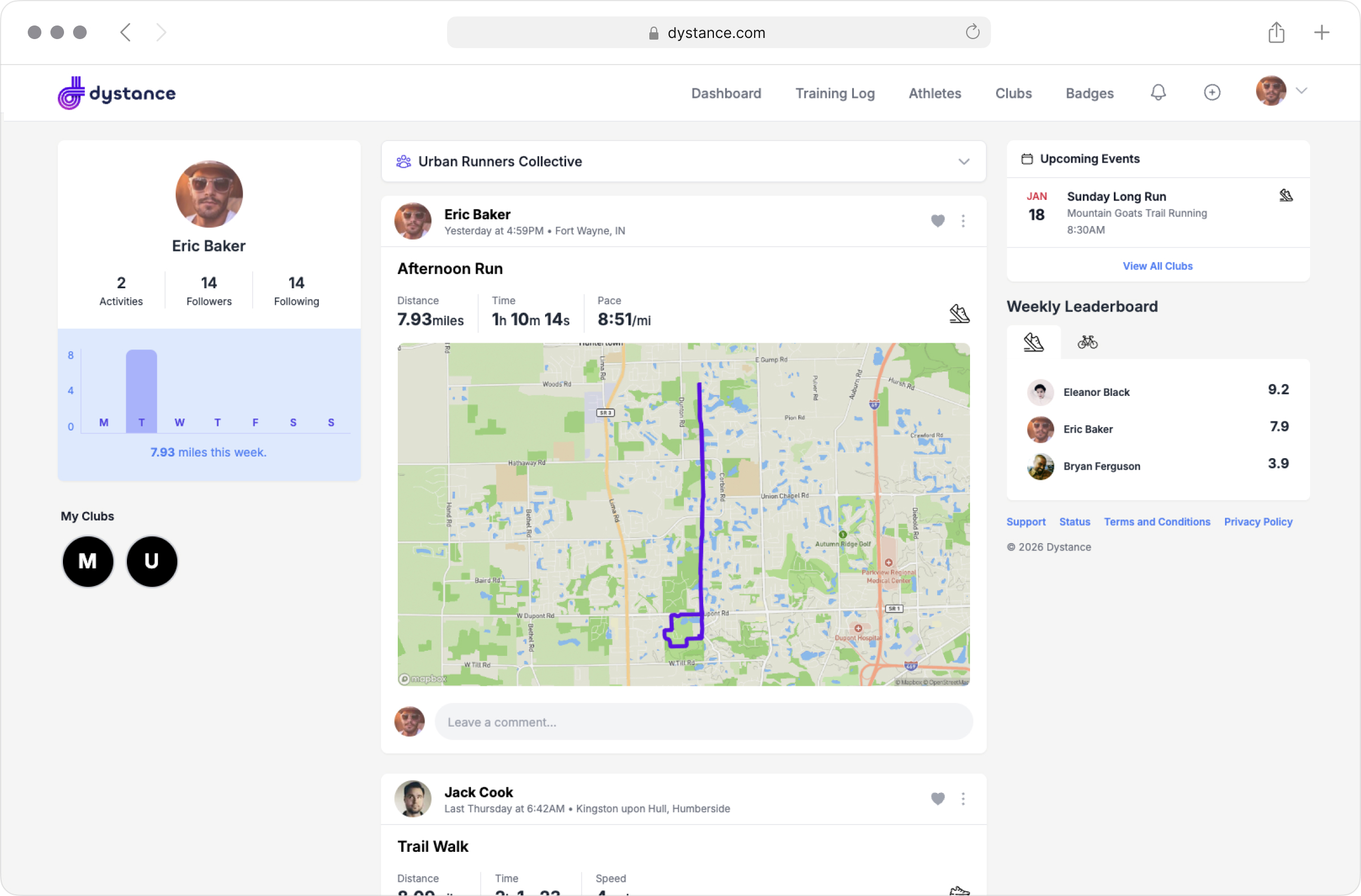 Dystance supports running, cycling, hiking and walking activities. For club tracking and analytics, only activities that match your club type will be included.