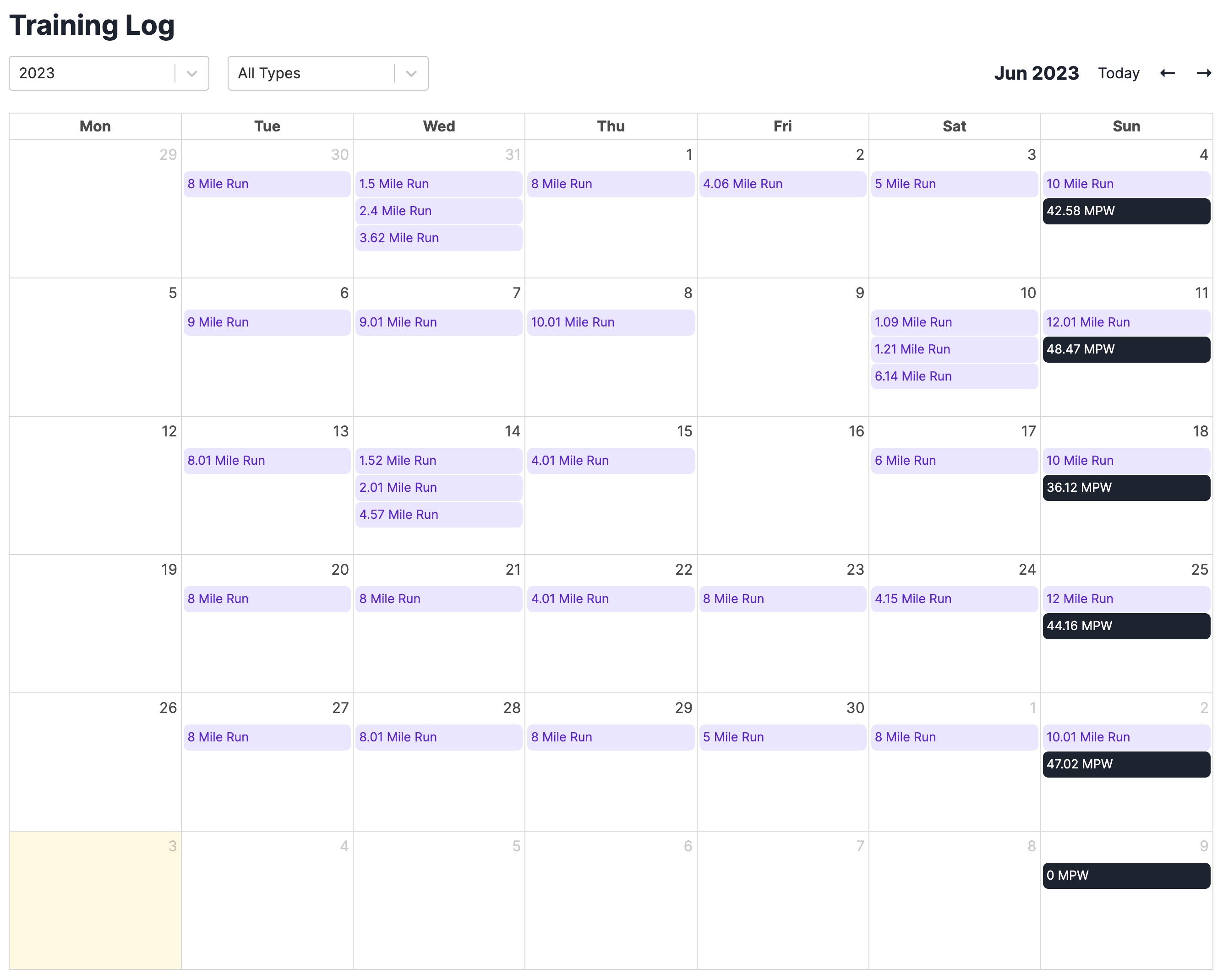 View your historical training data. Filter by activity type, date range, and more.